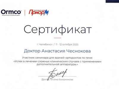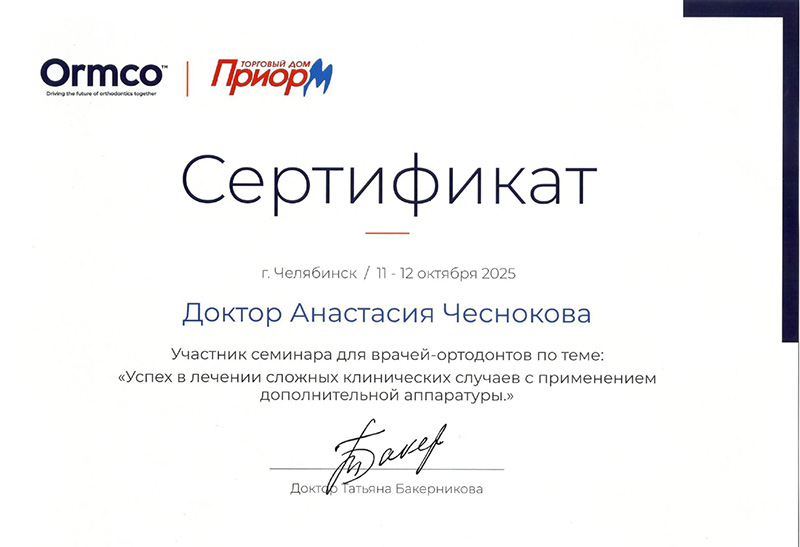 2025г. Участница семинара для врачей –ортодонтов по теме: «Успех в лечении сложных клинических случаев с применением дополнительной аппаратуры». Лектор: Татьяна Бакерникова. Ormco. г.Челябинск.