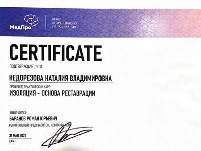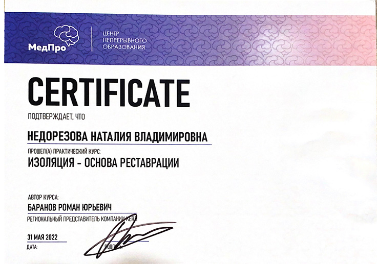 2022г. Прошла практический курс: «Изоляция – основа реставраций». Лектор: Баранов Р.Ю. Учебный центр – МедПро.