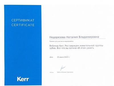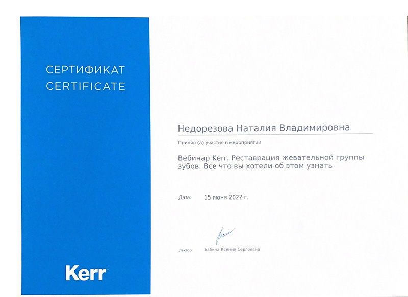 2022г. Приняла участие в мероприятии: «Вебинар Kerr. Реставрация жевательной группы зубов. Всё что вы хотели об этом узнать». Лектор: Бабина К.С.