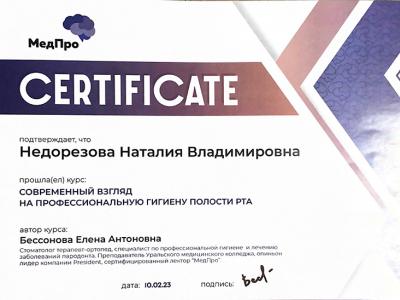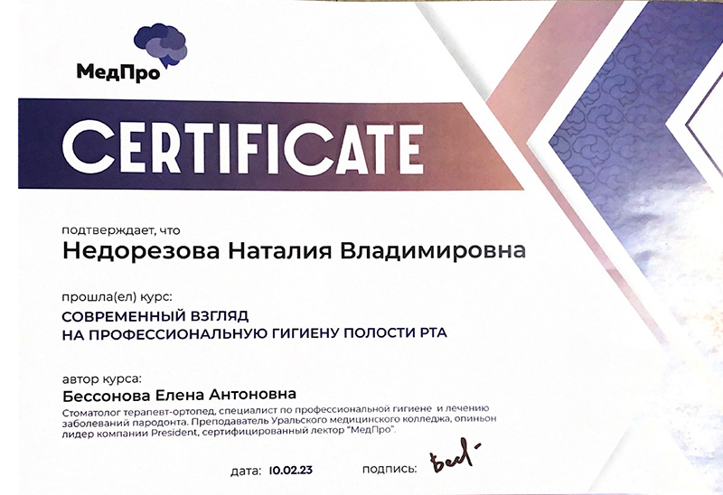 2023г. Прошла курс: «Современный взгляд на профессиональную гигиену полости рта». Автор курса: Бессонова Е.А. Учебный центр МедПро.