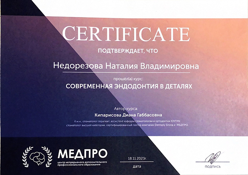 2023г. Прошла курс: «Современная эндодонтия в деталях». Автор курса: Кипарисова Д.Г. Учебный центр МедПро.