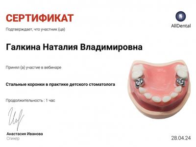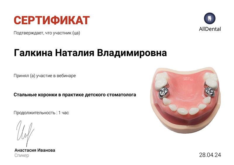 2024г. Участница вебинара: «Стальные коронки в практике детского стоматолога». Спикер: Иванова Анастасия. AllDental.