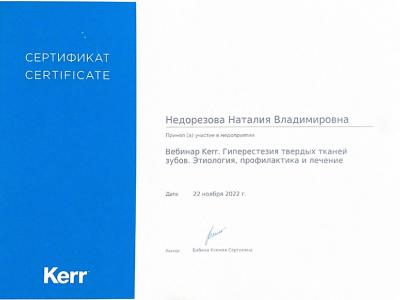 2022г. Приняла участие в мероприятии: «Вебинар Kerr.Гиперестезия твердых тканей зубов. Этиология, профилактика и лечение». Лектор: Бабина К.С.