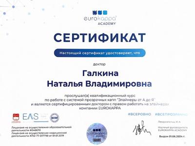 2024г. Прослушала квалифицированный курс по работе с системой прозрачных капп «Элайнеры от А до Я». Сертификат с правом работать на элайнерах компании Eurokapa.