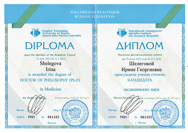 2025г. Российский университет дружбы народов им. Патриса Лумумбы. Диплом о присуждении учёной степени кандидата медицинских наук. г. Москва